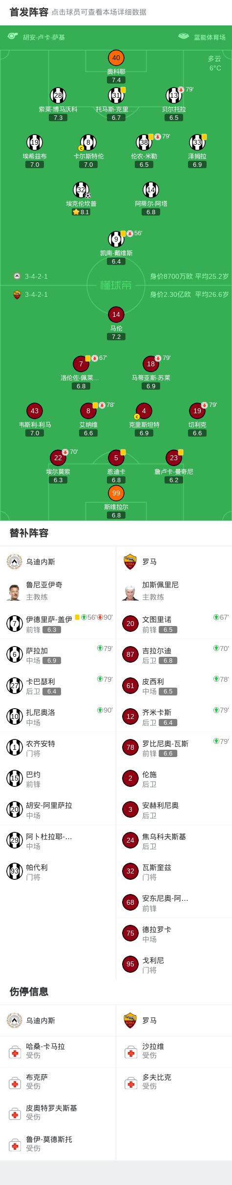 北京时间2月3日意大利足球顶级联赛联赛第23轮,乌迪内斯主场对阵罗马。上半场双方战平,阿塔、埃克伦坎普远射对罗马球门造成威胁。下半场,埃克伦坎普任意球直接破门打破僵局。第90分钟,克里斯坦特进球被吹。最终,乌迪内斯主场1-0战胜罗马。